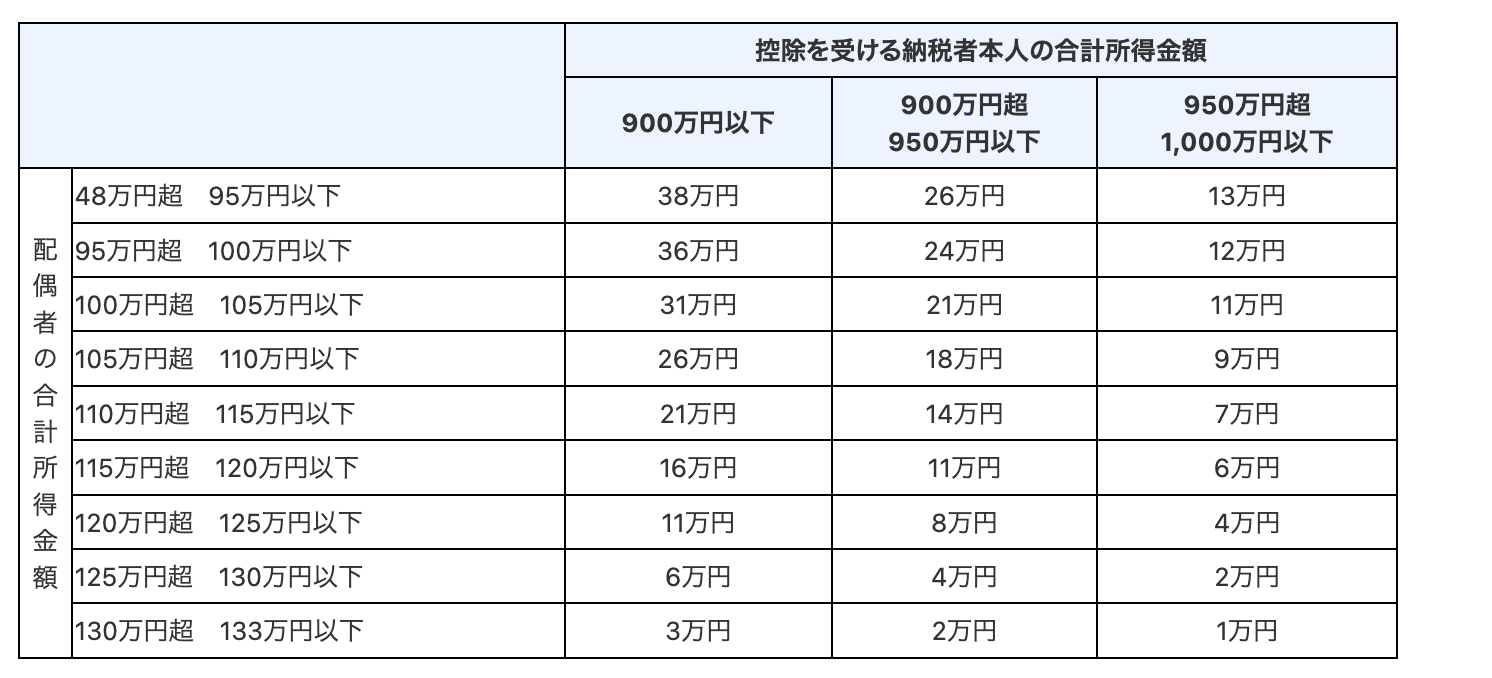 表によると所得は95万円を超えてから徐々に控除額が少なくなり、所得133万円を超えると控除額が0円になることがわかります。