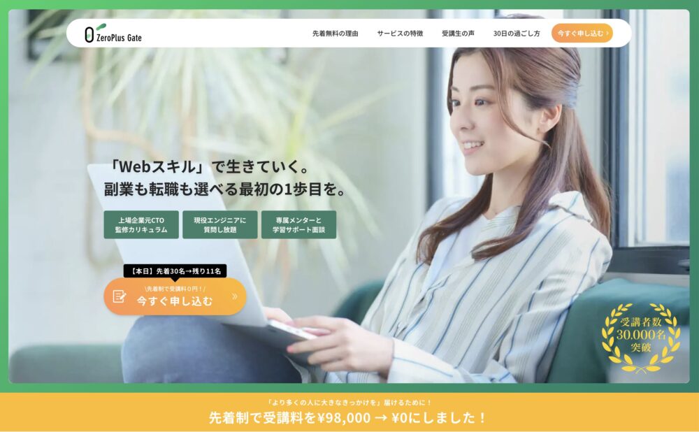 ZeroPlus GateはHTML/CSSを無料で30日間学べるプログラミングスクールです。サービスの概要を以下にまとめています。