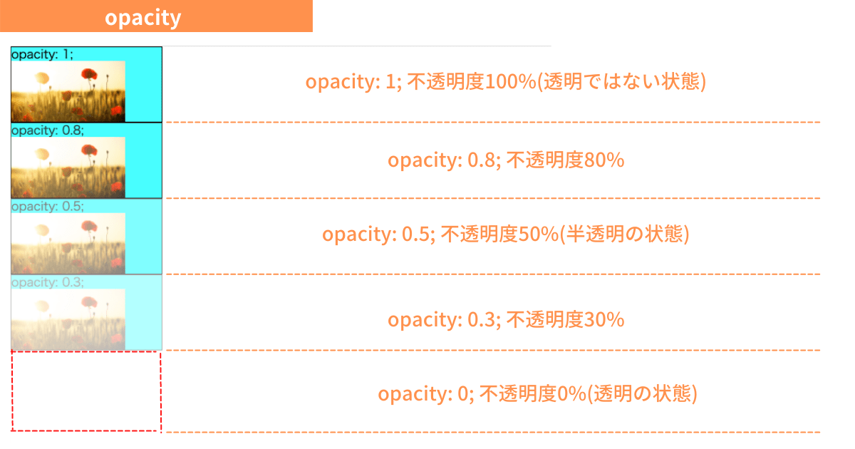 特徴:数値を指定することで、要素の透明度を調整できる(数値が0に近いほど要素は透明に近づく)