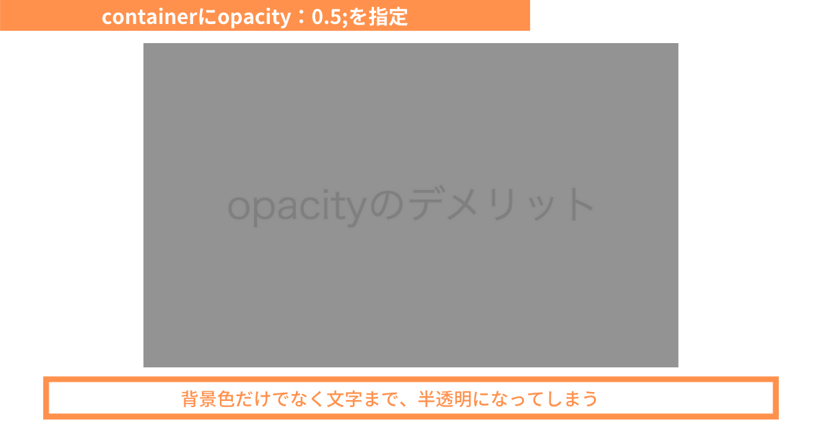 よって親要素に指定したopacityの数値に応じ、テキストや画像などの子要素まで透明化しています。