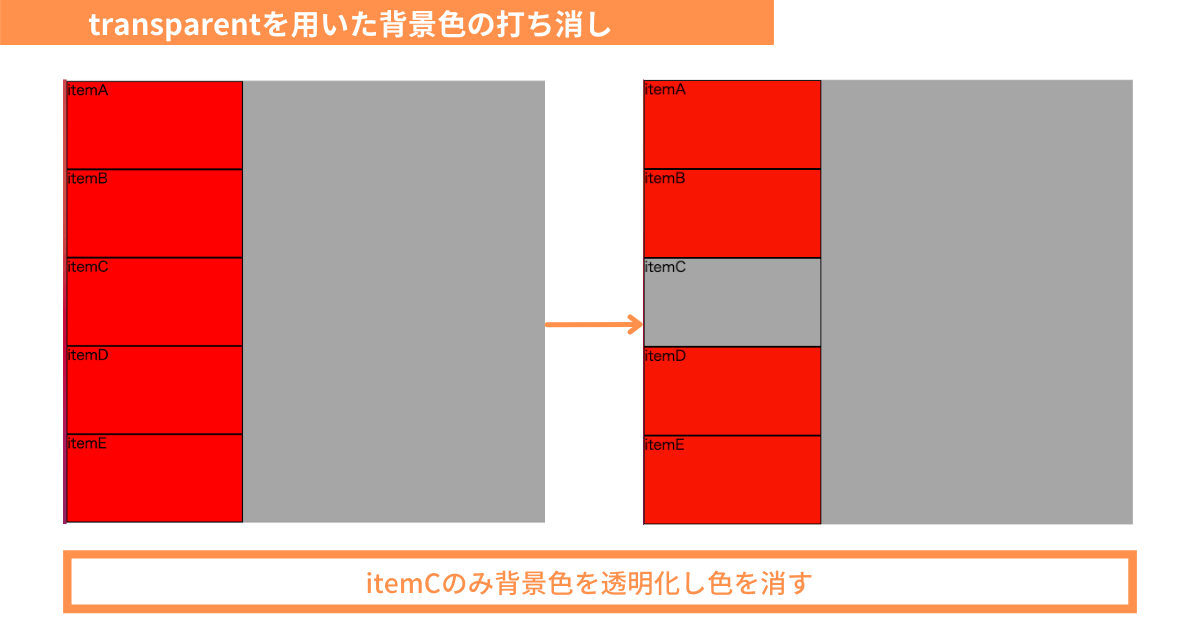 }item全てに指定した背景色を、transparentを用いて「itemC」のみ打ち消すことができました。