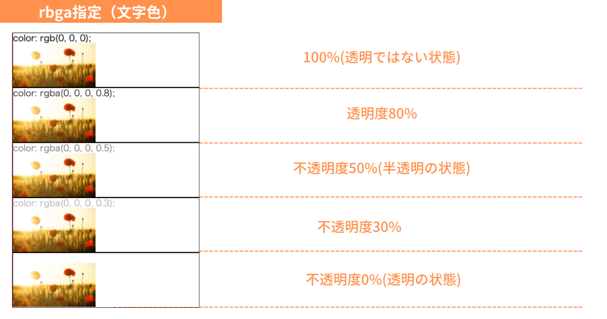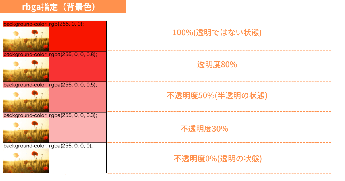| rgba指定 | 要素の色の透明度を、数値で調整する |