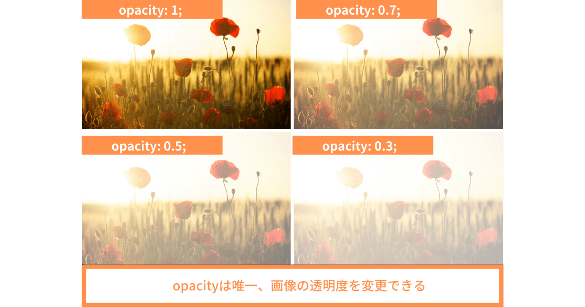 | メリット | 唯一画像要素を透明化できる | 子要素に影響を与えることなく、親要素を透明化できる | 子要素に影響を与えることなく、親要素を透明化できる |
