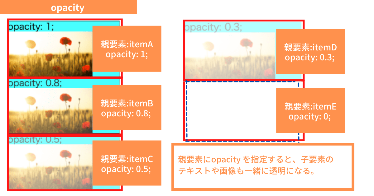 opacityを0に指定した「itemE」では完全に透明化し、子要素のテキストや画像など全てが見えない状態となりました。